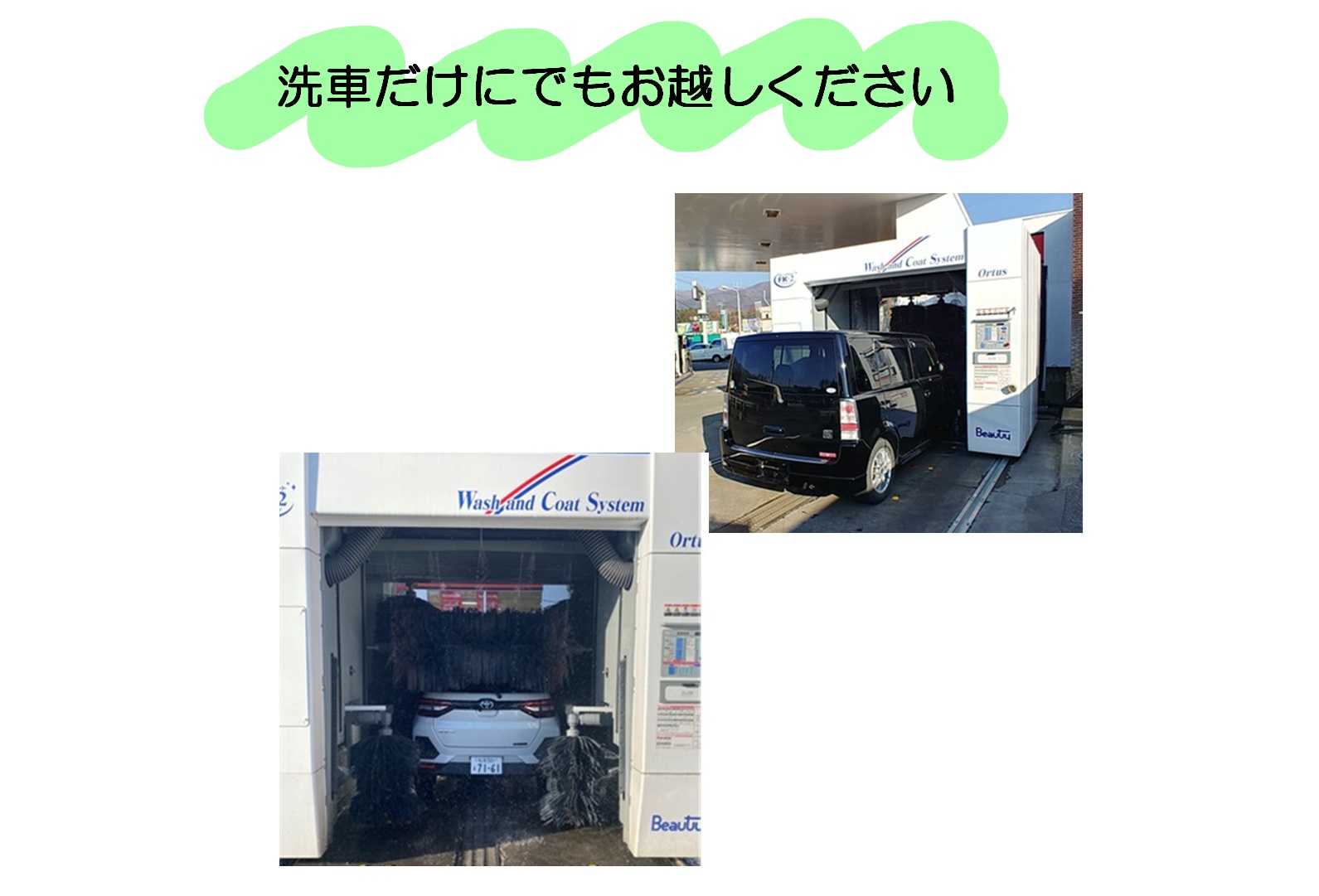 燃料はもとより、洗車、オイル、タイヤ、車検、レンタカー、車販売、買取など、トータルカーケアショップとして、車のことならすべて取り扱っております。